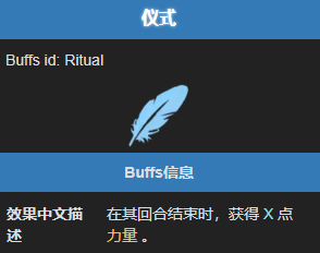 效果机制:当单位拥有仪式状态时,会在每回合结束时获得 X 点力量。力量的增加会直接提升后续攻击卡牌造成的伤害数值。由于该效果可叠加,层数越高,每回合获得的力量加成也就越多,成长潜力巨大。