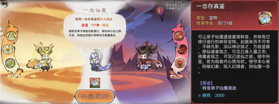 通过消耗特殊道具“一念存真鉴”,来直接更改弟子的仙魔职业!