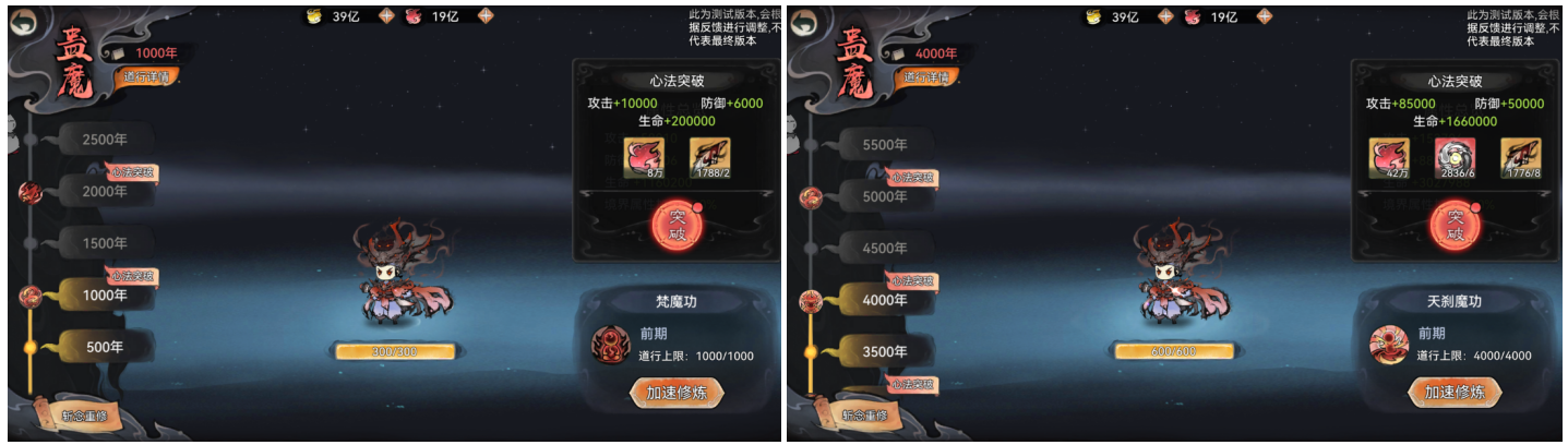 当弟子心法道行达到瓶颈时,需要消耗“魔气”或“仙气”、“煞狱骨”和“混沌源气”来助其突破。