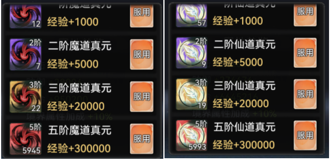 当然,我们也可以用使用特殊道具“真元”来加速弟子的心法修炼速度(仙使用“仙道真元”,魔使用“魔道真元”),