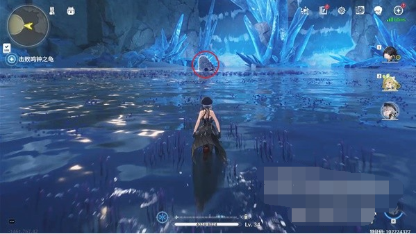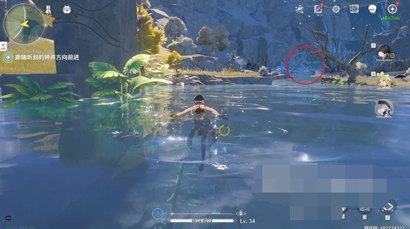 7、走到一半听到有钟声响起,这时基本也能看到河流右侧有冰的区域了,乌龟就在画圈处的河道中休息。