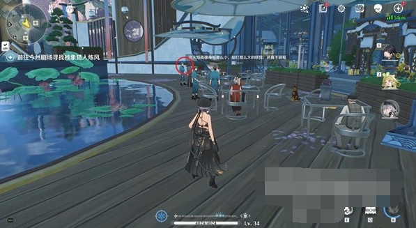 4、在这里与画圈的人群互动即可找到猎人炼风,先过剧情,对话结束后再次与附近的炼风对话。