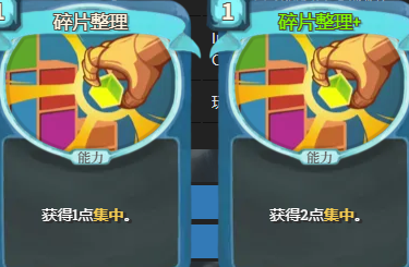 集中是故障机器人的核心机制,相关卡牌包括蓝色稀有攻击超能光束,使用后可能降低集中;蓝色罕见技能耗尽,消耗充能球,可能涉及集中;蓝色罕见能力碎片整理,可获得集中;蓝色稀有能力偏差认知,可获得大量集中但每回合衰减。