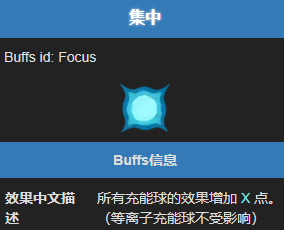 集中状态的中文描述为:所有充能球的效果增加 X 点。(等离子充能球不受影响)。英文描述为:Increases the effectiveness of Orbs by X。该状态属于玩家 BUFF,可叠加。
