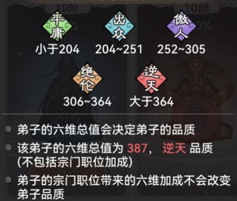 最后,在不考虑额外【词条】的情况下最多只能将弟子品质提升到【绝伦】,如果想将弟子品质抬到【逆天】,就需要祖师们对弟子更进一步的培养啦!(我们可以补六维中比较少的部分,当六维总值大于364,弟子品质自动变为【逆天】,宗门职务带来的加成不算在内。)