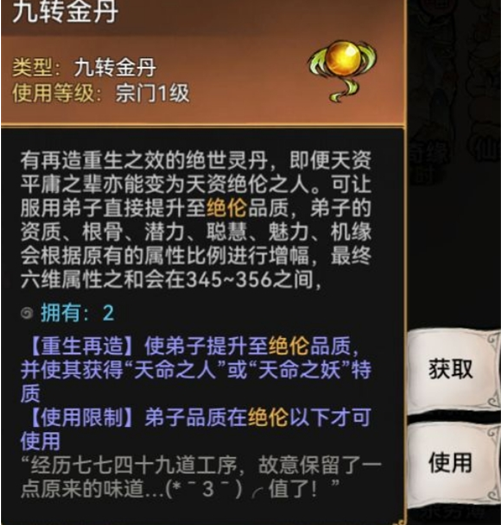 需要注意的是,【九转金丹】所带来的六维提升总值是一定的,在使用六维提升道具后,金丹对其他属性的加成可能会有所变化。其次,【九转金丹】的提升是只与弟子的【基础属性】有关的,即排除掉【词条】加成之后的属性。