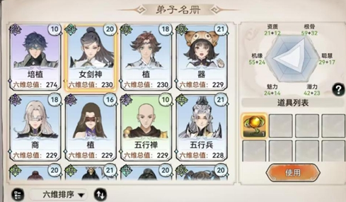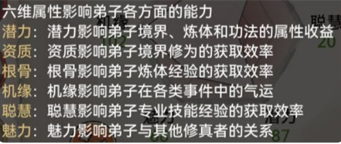 《最强祖师》游戏中弟子的六维属性包括潜力、资质、根骨、机缘、聪慧、魅力,每项属性对弟子的成长和战斗表现有着独特且重要的影响。以下是最强祖师挑选战斗弟子时六维的影响讲解。