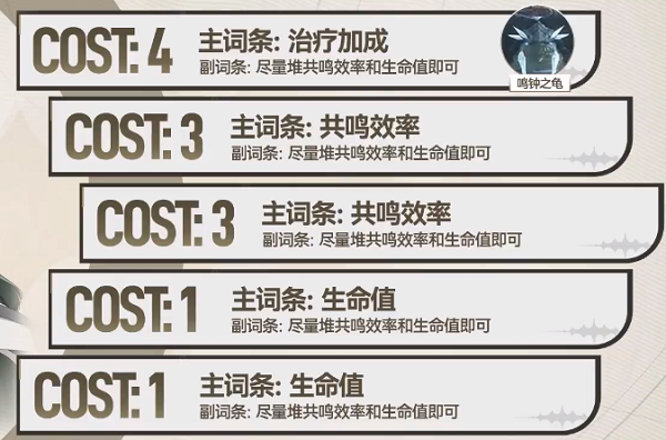 声骸主词条方面,cost4选择治疗加成,cost3选择共鸣效率,cost1选择生命值。