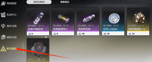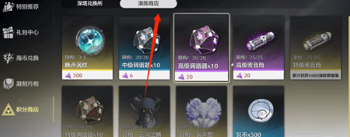 2、然后点击左侧状态栏下方的积分商店,接着在深塔兑换所页面,可以兑换50个【高级密音筒】,每月最多50个。
