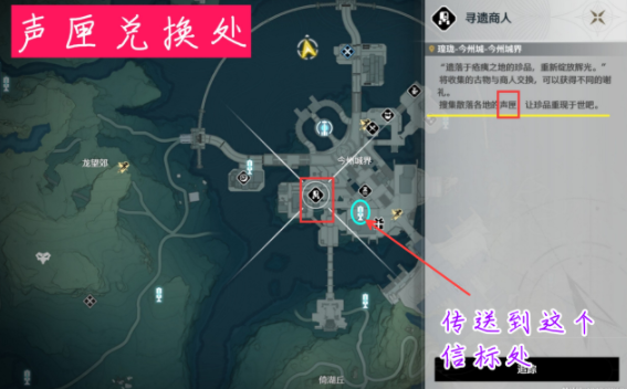 1、声匣商人就在【今州城】位置,可以先传送到下图位置: