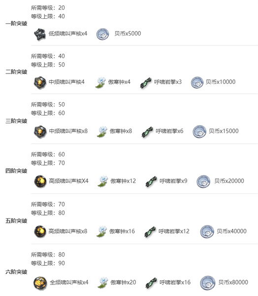 5、五阶突破:高频啸叫声核x8、傲寒钟x16、呼啸岩拳x12、贝币x40000