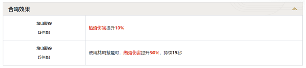 2、4件套:使用共鸣技能时,热熔伤害提升30%,持续15秒。这个效果其实就很强了,触发方便,数值给的也够。共鸣技能就可以启动,30%的伤害加成持续15秒。