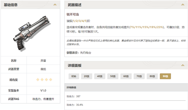 3、配枪:奔雷。这个其实跟上面的短剑很像。但是它目前有一个很适配的角色炽霞,不过优先级依旧不高,只能说未来可期。