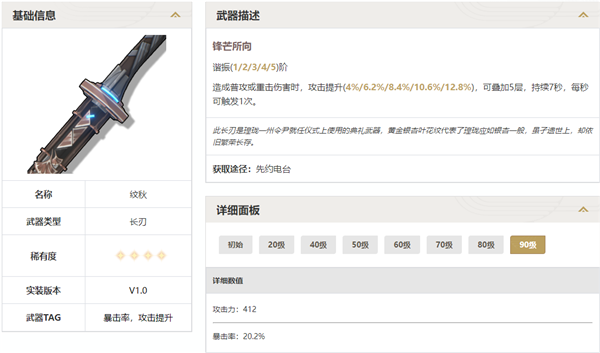 2、长刃:纹秋。这个武器就有说法了。首先词条给了比较稀缺的暴击属性。特效是打普攻和重击时可以提升攻击力。跟当前版本忌炎以及1.1版本的今汐都很适配,不想抽武器又想玩这两个角色的玩家可以换取一把。优先级非常高。