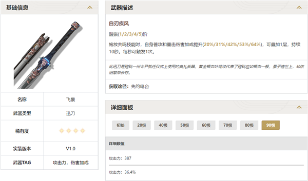 1、短剑:飞景。首先武器基础攻击力太低,意味着百分比攻击的效能也很低。这一类武器其实是陷阱。再看特效,释放共鸣技能给普攻和重击增伤,在当前版本似乎只能适配散华,因此这个版本不建议换取。