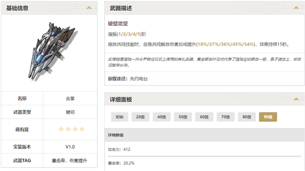 4、臂铠:金掌。也是宝贵的暴击词条,特效是放小技能时给大招增伤。想玩鉴心或者凌阳的可以换一把这个。优先级一般。
