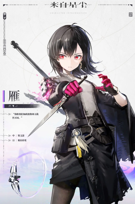 接下来要推荐的角色便是雁,她也是一位女性角色。雁的形象带着神秘的冰冷,乌黑长发、深色外套、炽红眼眸。游戏中,她展现出极具威力的战斗实力。与薇一样,在游戏伊始阶段,新手玩家就能拥有雁这个强力角色。