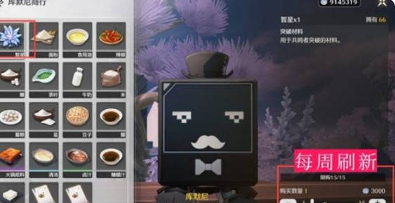 2、库默尼商行中暂星单价为3000金币,每周可购买15个。