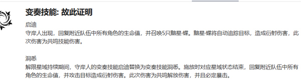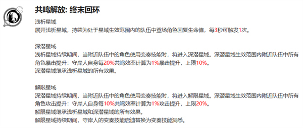 共鸣技能:这是守岸人治疗的核心技能,释放一次E技能就能让全队回血。如果把守岸人当成奶妈来用,建议把这个技能点满。