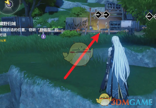 3、找到营地后需要找一个合适的位置偷听,等待野兽帮的人离开,需要在营地调查三个发光道具。
