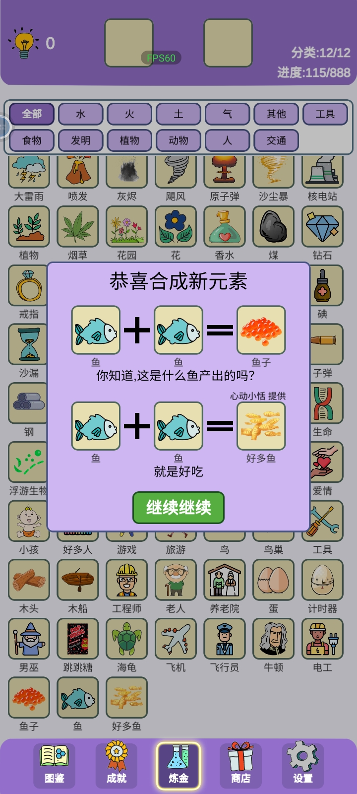 简单的炼金术是一款别具一格的休闲合成游戏,通过合成四种基本元素,创造出宇宙中无尽的奇妙事物。元素组合几乎是无限的,让玩家可以不断探索和尝试,创造出令人惊喜的新元素。游戏中好多鱼怎么合成呢?今天小编给大家带来的《简单的炼金术》好多鱼合成公式分享:鱼+鱼=好多鱼。