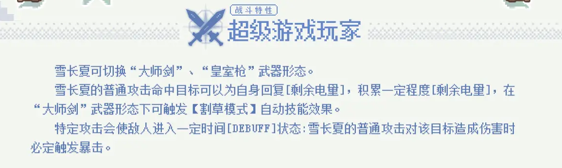 1、战斗特性:雪长夏可切换大师剑、皇室枪两种武器形态,普通攻击命中目标时可以为自身回复剩余电量,剩余电量达到一定水平会触发割草模式自动技能效果。