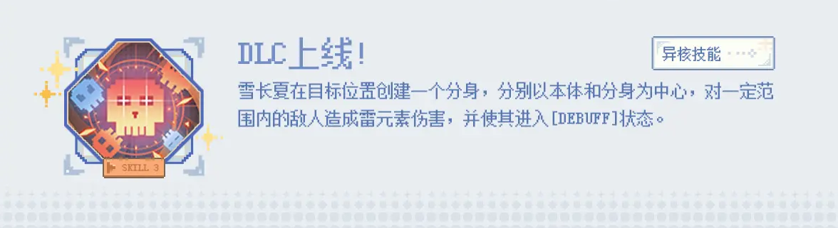 5、DLC上线:是雪长夏的异核技能,雪长夏在目标位置创建一个分身,以本体和分身为中心对范围内的敌人造成雷元素伤害并附加DEBUFF。