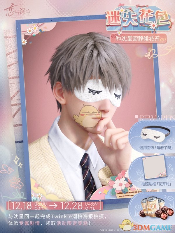 1、与沈星回一起根据照相馆员工OTTO-PHO的提示完成海报拍摄,达到指定星级即可领取通用面饰「睡着了吗」、拍照边框「花开时」、「黑电能量·重磅」及「快乐巧克力」奖励。