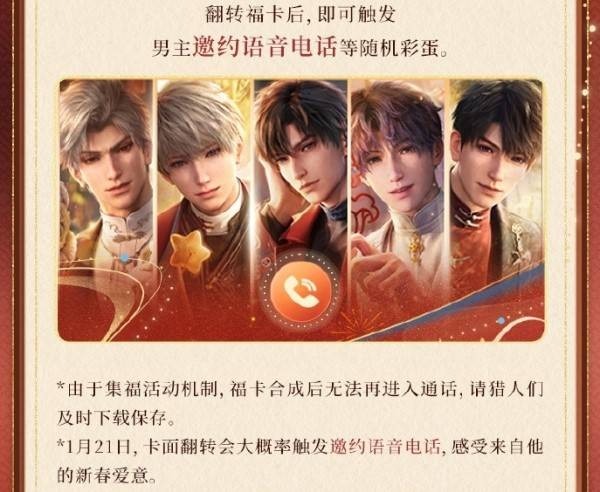 卡面彩蛋:1月21日,卡面翻转时可大概率触发男主邀约语音电话,感受满满的新春爱意。
