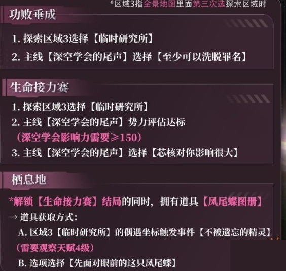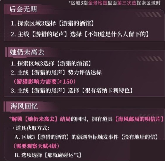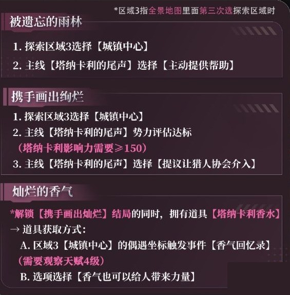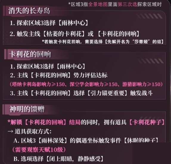 5、触发主线【卡利花的回响】需要全部达成以下三个结局:【携手画出绚烂(塔纳卡利岛)】、【生命接力赛(深空学会)】、【她仍未离去(游猎)】