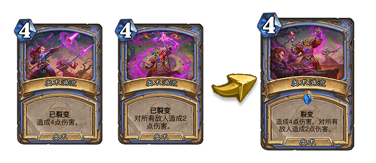 具有裂变关键词的卡牌在加入手牌时会一分为二,并分别位移至手牌的两端。你可以单独使用每个碎片,但如果你打出了位于它们之间的卡牌,使碎片接触重组,那么它将合二为一,并拥有两项强大的合并效果。