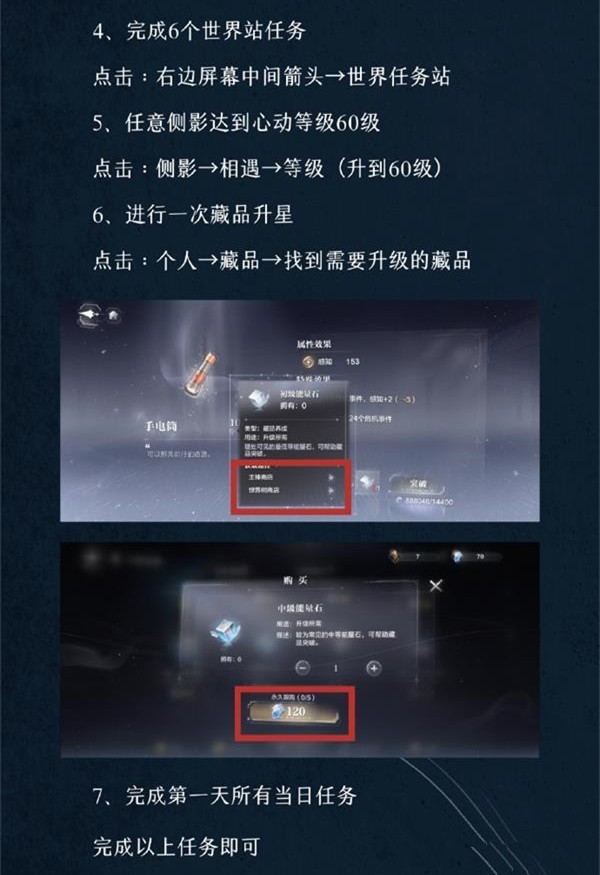 世界之外公测后七日任务将会开启,很多小伙伴想知道世界之外第六天怎么做?今天小编就给大家带来了《世界之外》第六天玩法攻略分享,累计登录游戏6天,任意侧影达到心动等级60级,点击:侧影→相遇→等级(升到60级)。进行一次藏品升星,点击:个人→藏品→找到需要升级的藏品。