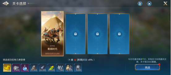 沙盘推演是《世界启元》中奖励相当丰富的关卡玩法,共四关,分别进入青铜时代、铁器时代、火器时代、工业时代开启新关,每日仅可通关一次且所有关卡共用通关次数。