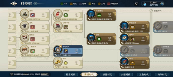 玩家最初进入游戏时,便可依次学习种植、侦查和制陶术这三种科技,完成这些研究后,游戏中的科技树会不断衍生出新的项目和分支,不同分支的科技类型,会在短期内决定玩家的文明发展重心,但不管是优先发展哪类科技,最终等到所有属于同一时代的科技研究完成后,玩家就将迈入时代进步的大门。