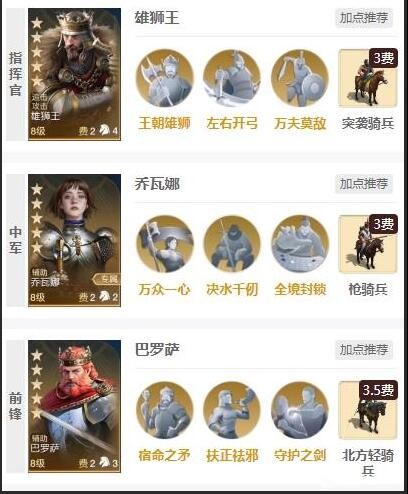 这套阵容属于强输出类型的追击阵容,雄狮王加上乔瓦娜本身就是追击多伤流的代表,巴罗萨加入后可以担任前锋位给两名核心角色进一步提升输出。推荐巴罗萨使用输出流技能在这套阵容中。