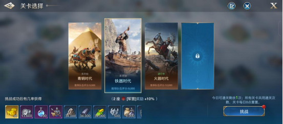 沙盘推演是《世界启元》中奖励相当丰富的关卡玩法,共四关,分别进入青铜时代、铁器时代、火器时代、工业时代开启新关,每日仅可通关一次且所有关卡共用通关次数。