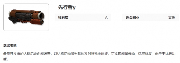 艾塔纪元先行者γ图鉴介绍,最早开发出的达格尼定向能装置,以达格尼物质为载体发射特殊电磁波,可实现能量传输、远程修复、电子干扰等功能的武器,下面小编给大家带来艾塔纪元先行者γ图鉴介绍,有需要的小伙伴一起来看看吧。
