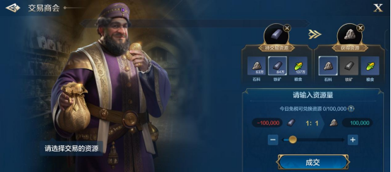 交易商会的使用非常简单,即将一种资源置换成另一种资源,目前只支持石料、铁矿、粮食三种资源的互相置换。