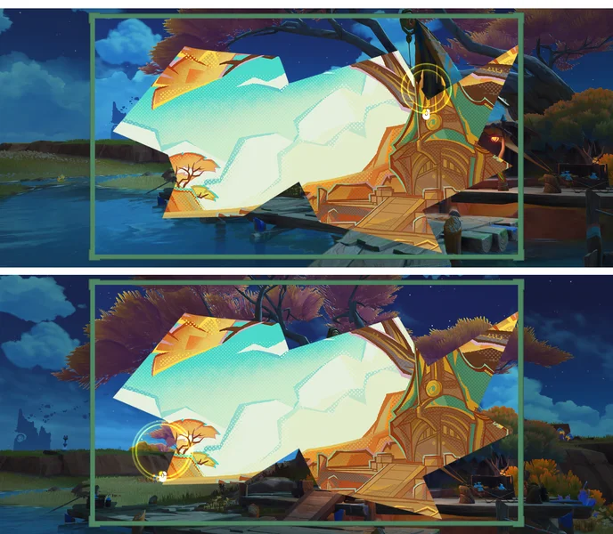 ● 在「胜景细览」玩法中,需要将风景画与眼前实景进行比对,寻找缺失的景物。