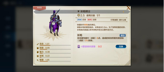 “长枪骑士”:费用2.5、攻击:1.37、防御:0.95、敏捷:1.05
