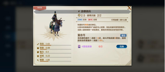 “游袭骑兵”:费用2.5、攻击:1.43、防御:0.88、敏捷:1.08