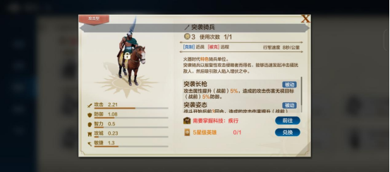 突袭骑兵:费用为3、攻击:2.21、防御:1.08、敏捷:1.3