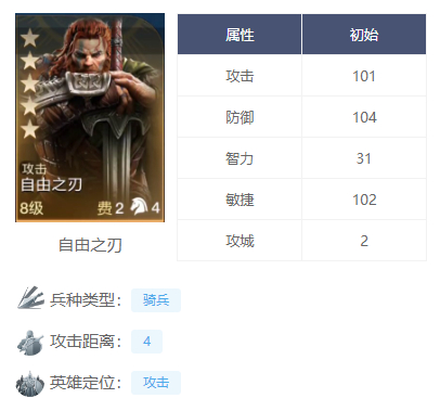 自由之刃的自带技能是【高地禁制】可以打一波全体aoe伤害,还可以使目标陷入禁疗状态,让敌方无法得到有效的治疗效果,非常克制以奶为主的阵容。