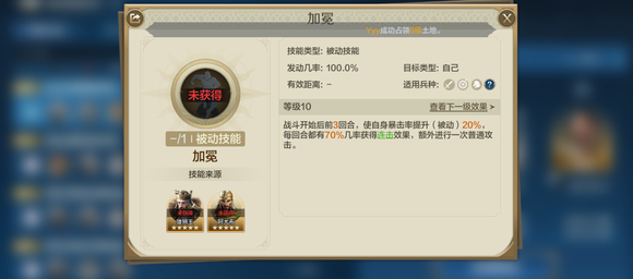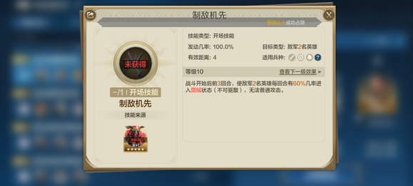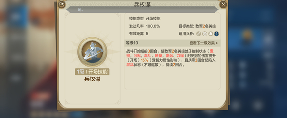 自带技能【兵权谋】:战斗开始后前3回合,使敌军2名英雄处于控制状态时受到的伤害提升15%(受智力属性影响),且从第3个回合起陷入混乱状态(不可驱散),持续2回合。