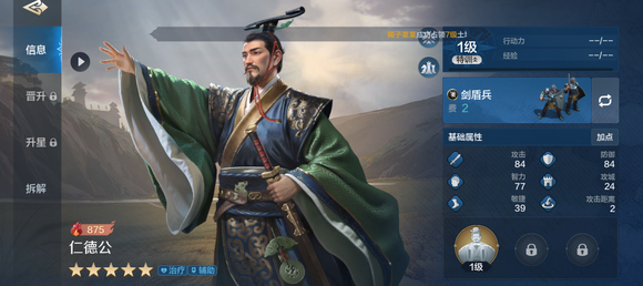 【制敌机先】作为控制技能,为仁德公提供了补足队伍短板的能力,通过制造稳定的输出环境,协助队友进行持续输出,同时确保队伍在战斗中的生存和输出节奏;【整军经武】技能开场时赋予我军两名英雄治愈状态,个人回合开始时有一半概率恢复可观的兵力,显著增强了队伍的生存力,进而提升了整体输出能力,确保队伍能在战斗中持久作战。