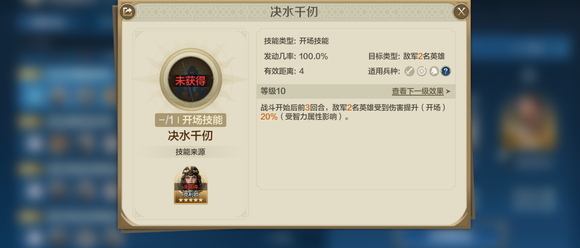 【全境征战】拥有35%的发动几率,能对敌军随机目标造成总计5次高智力伤害。这一技能不仅能在战斗中频繁发动,造成大量伤害,还能通过军神的智力属性进一步提升伤害效果;【决水千仞】技能可以增强敌军所受伤害,效果持续三回合,显著提升友军输出。结合【全境征战】的削弱效果,军神能够进一步强化友军攻击力,使敌军在战斗中处于劣势。