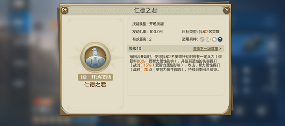 自带技能【仁德之君】:每回合开始,使得我军2名英雄行动时恢复一定兵力(受智力属性影响】,并使其造成的伤害提升15%(战时),攻击、智力属性提升20点(战时),持续到本回合结束。