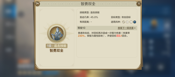 自带技能【智勇双全】:普通攻击后,对目标再次造成一次智力伤害(伤害率230%,受智力属性影响),并使目标混乱1回合。