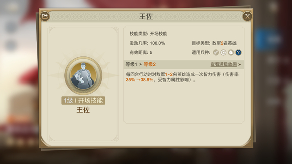自带技能【王佐】每回合行动时对敌军1~2名单位造成智力伤害,虽然这个技能没错造成的伤害不是特别高,但是次数多啊,很容易就触发【长墙工事】了。