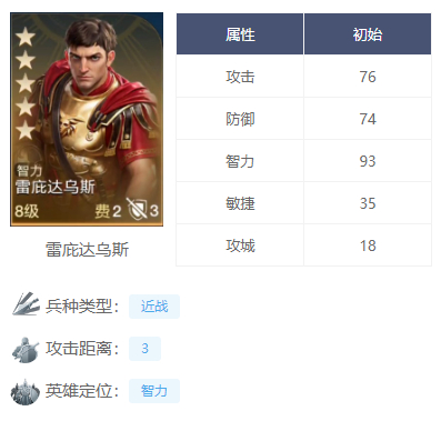 具有比较高的智力属性,在队伍中担任统帅的位置。把雷欧尼达替换成雷庇达乌斯是因为他的自带技能会更容易触发【长墙工事】,虽然这样子就没有羁绊【荣耀希腊】(让长墙工事5次就可以触发)